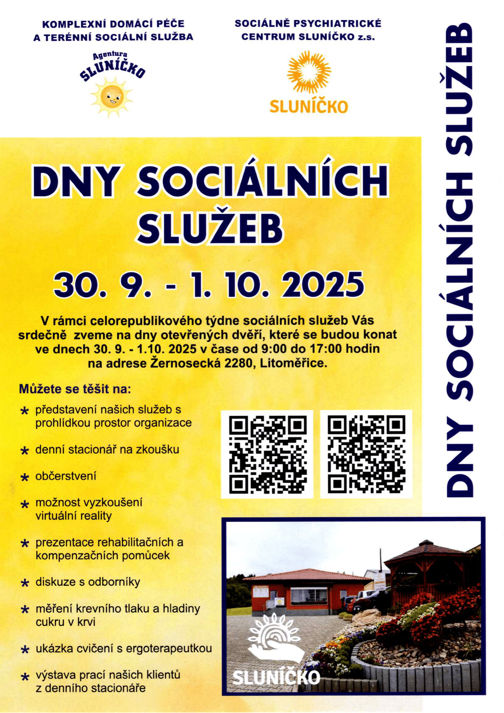Srdečně Vás zveme na naše dny otevřených dveří, které se budou konat 30. 9. - 1. 10. 2025 od 9:00 do 17:00 hodin na adrese Žernosecká 2280 v Litoměřicích. Budete mít možnost si projít a vyzkoušet, jak funguje náš denní stacionář, detailně Vám představíme námi nabízené služby a nebude chybět ani doprovodný program.