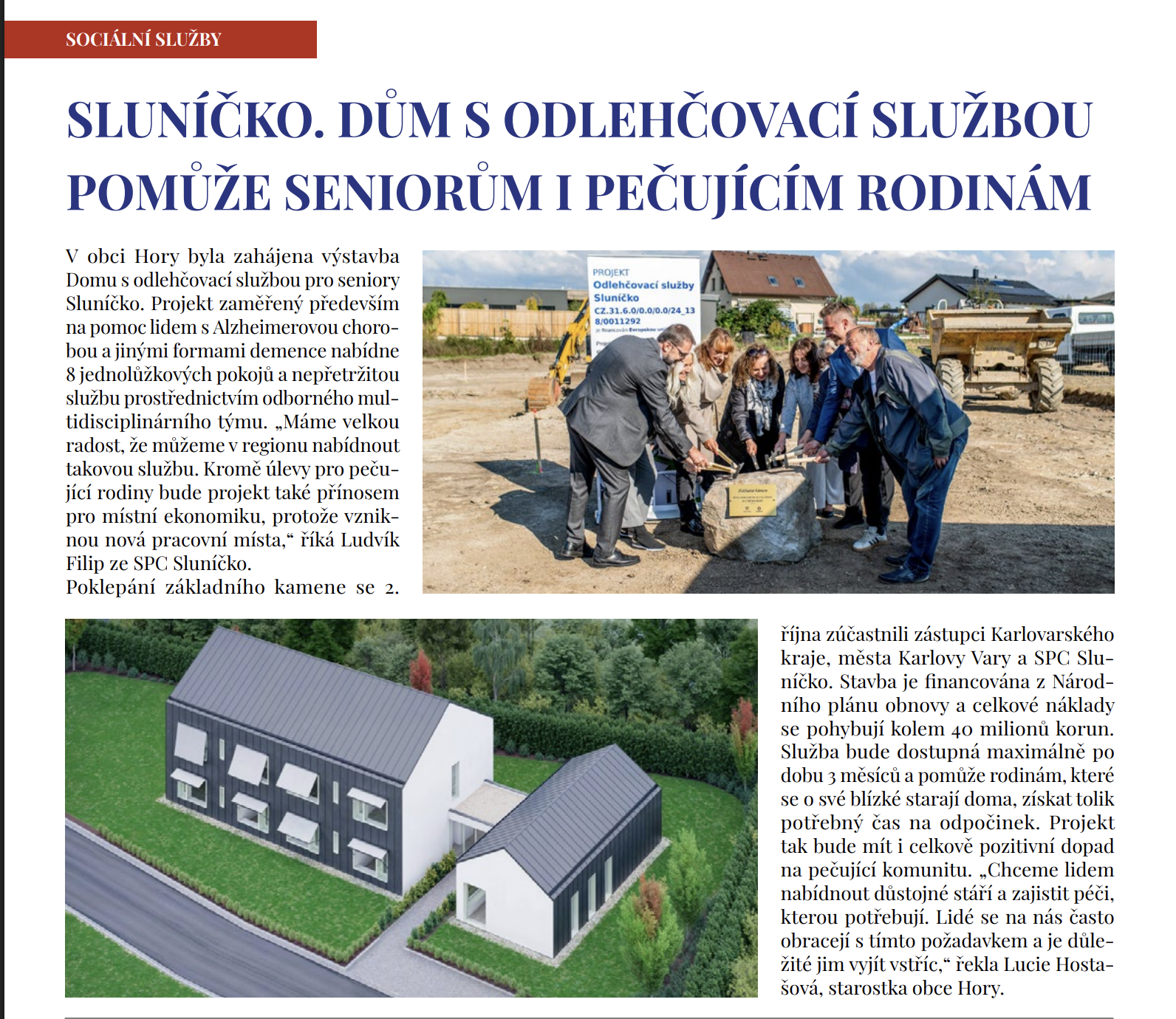 V listopadovém čísle již 23. ročníku měsíčního zpravodaje Karlovarského kraje Krajské listy byl 25. 11. 2025 zveřejněn článek o naší právě probíhající výstavbě domu s odlehčovací službou na pomoc lidem s Alzheimerovou chorobou a jinými formami demence v obci Hory. Celé vydání si můžete zdarma přečíst na tomto odkaze.