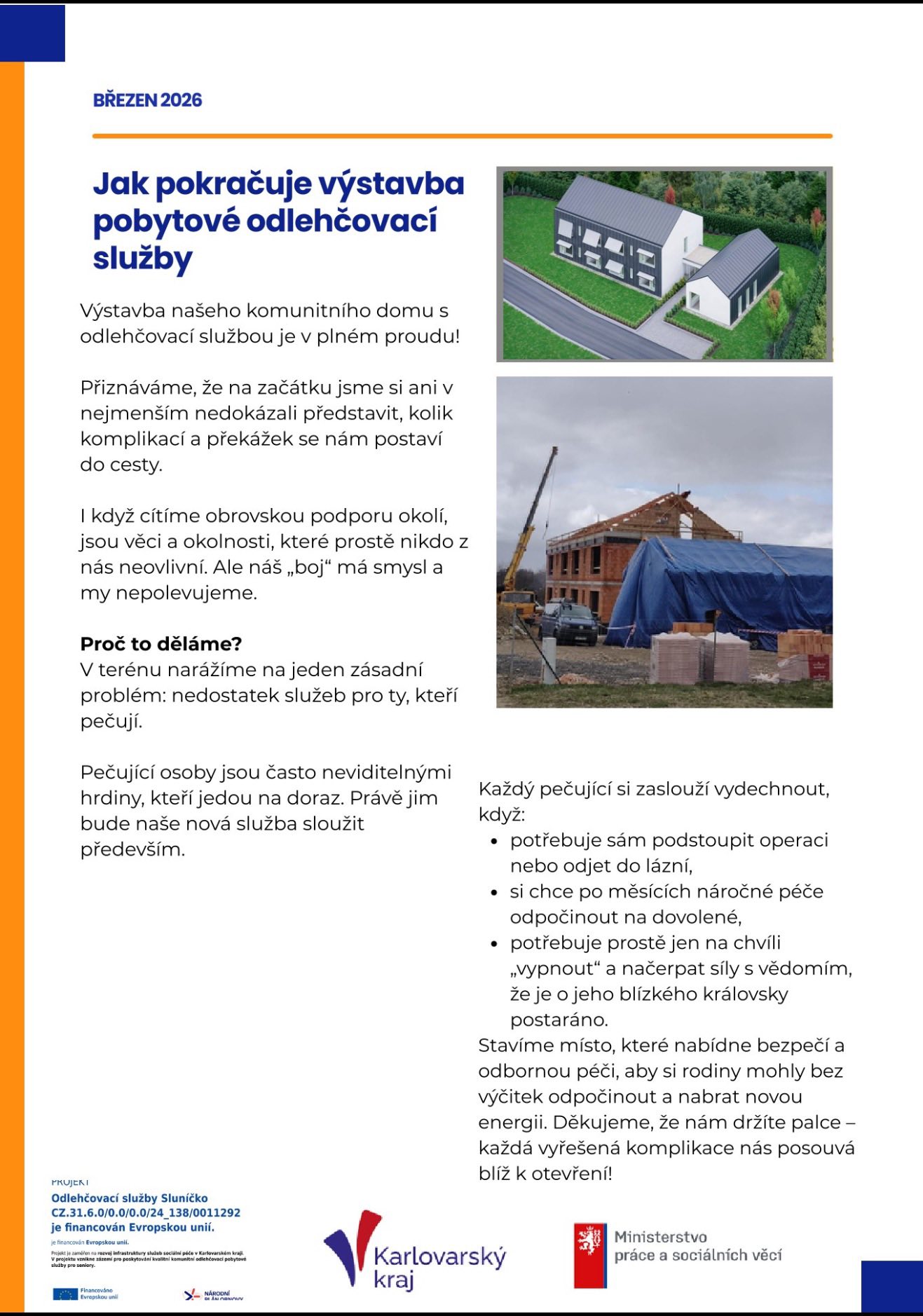 V listopadovém čísle již 23. ročníku měsíčního zpravodaje Karlovarského kraje Krajské listy byl 25. 11. 2025 zveřejněn článek o naší právě probíhající výstavbě domu s odlehčovací službou na pomoc lidem s Alzheimerovou chorobou a jinými formami demence v obci Hory. Celé vydání si můžete zdarma přečíst na tomto odkaze.